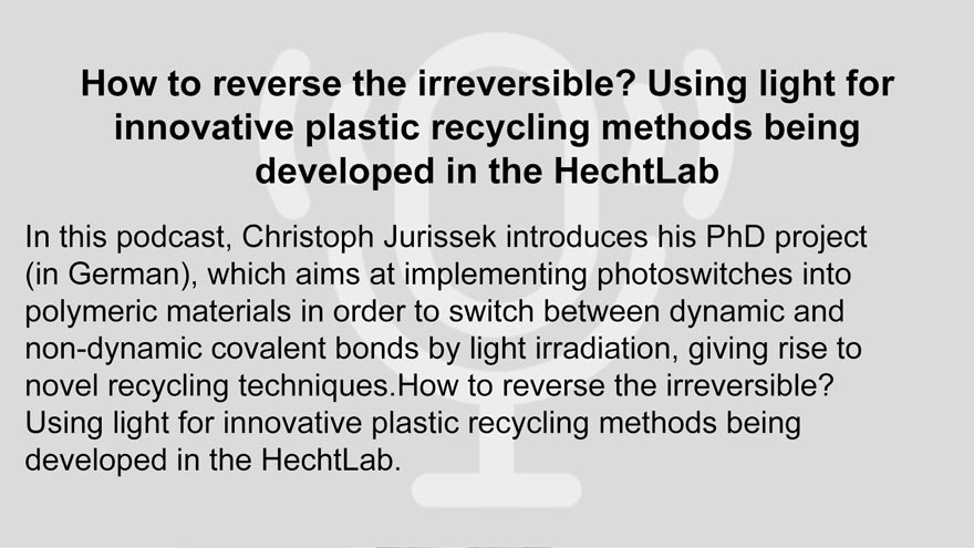 In this podcast, Christoph Jurissek introduces his PhD project (in German), which aims at implementing photoswitches into polymeric materials in order to switch between dynamic and non-dynamic covalent bonds by light irradiation, giving rise to novel recycling techniques.